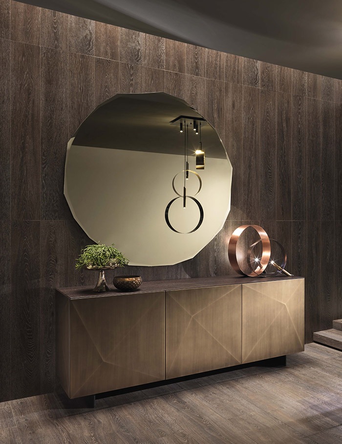 Quello di Riflessi è uno stile contemporaneo, caratterizzato da linee pulite ed essenziali, “ammorbidite” da delicati interventi decorativi realizzati con particolari tecniche di lavorazione, come la serigrafia e la martellatura.